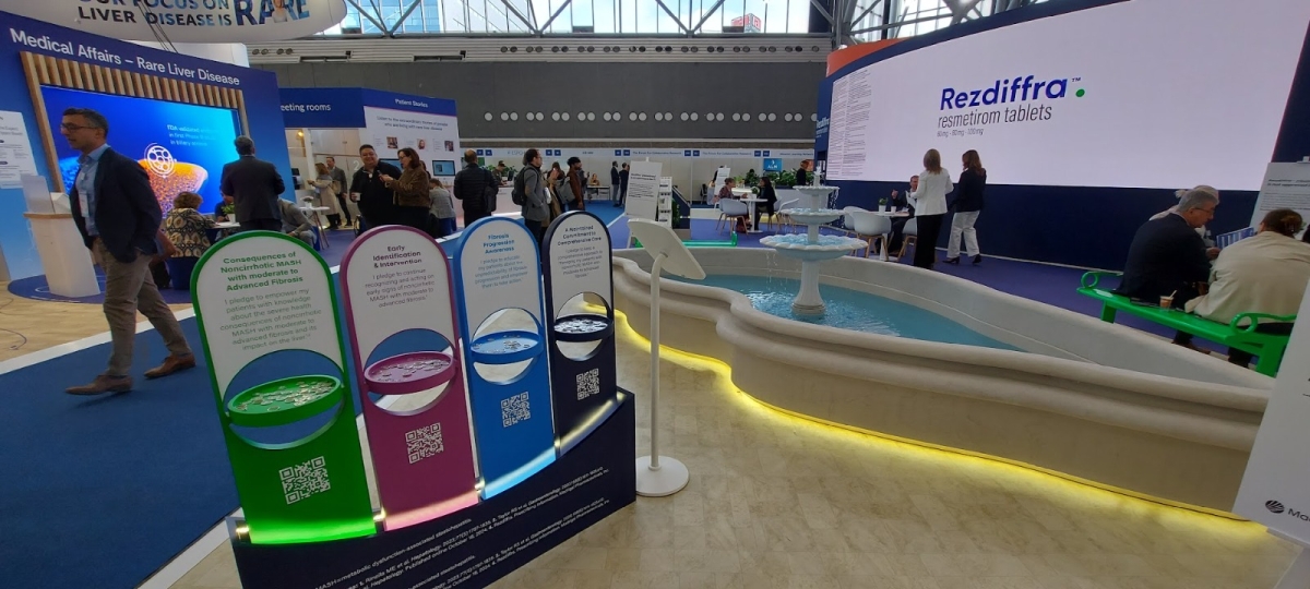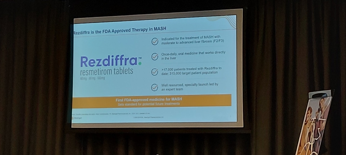 Táto pharma firma bola neprehliadnuteľná na EASL kongrese a preto sme sa veľmi tešili, že si jej predstavitelia našli čas a venovali nám samostatnú prednášku. Veď sa aj majú čím pochváliť – majú prvý liek na liečbu MASH, ktorý bol oficiálne schválený americkou liekovou agentúrou (FDA). Jedná sa o liek Rezdiffra s účinnou látkou resmetiron. Liek je zatiaľ dostupný len v USA, ale firma plánuje podať žiadosť o registráciu aj v Európe. Avšak, treba zdôrazniť, že liečba MASH nie je len medikamentózna, ale predovšetkým je potrebné zmeniť životný štýl.